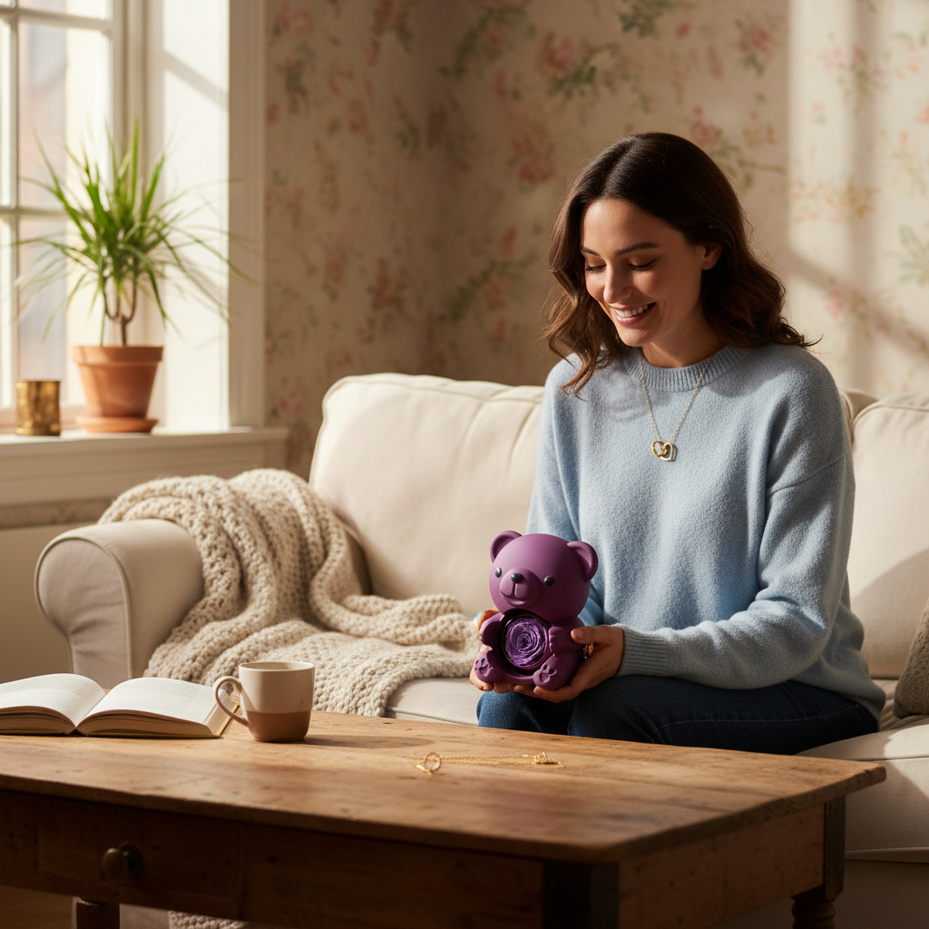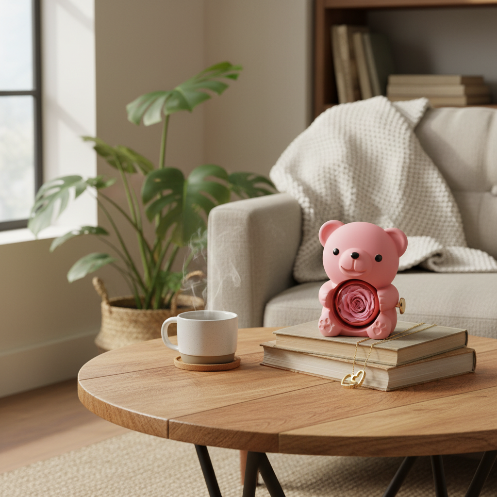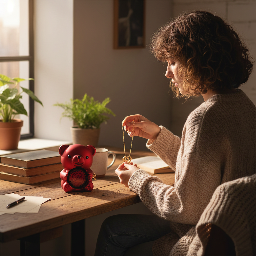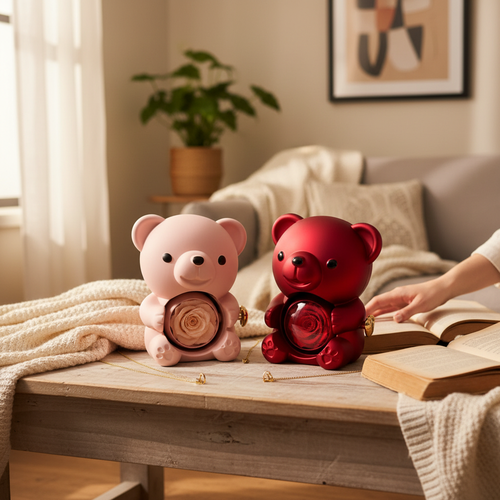 Rose éternelle + ourson + collier gravable : 3 cadeaux en un seul coffret adorable et unique